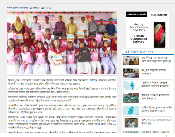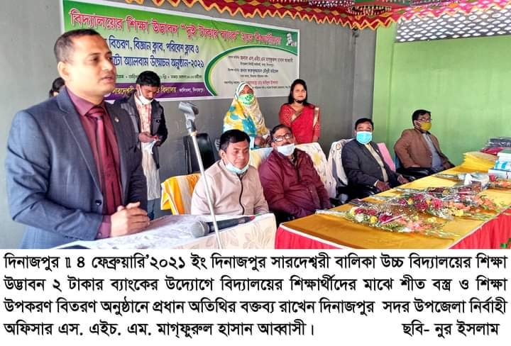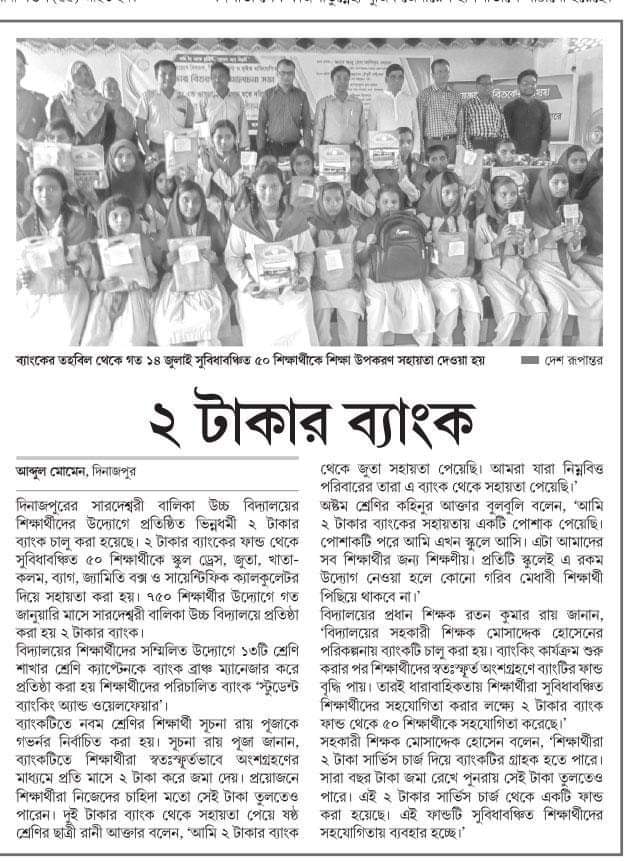 বিদ্যালয়ের ২ টাকার ব্যাংক হতে আর্থিক অভাবী প্রায় শতাধিক শিক্ষার্থীকে শিক্ষা-উপকরণ / স্কুল ড্রেস/ব্যাগ ইত্যাদি প্রয়োজনীয় উপহার দেয়া হয়েছে উক্ত অনুষ্ঠানের মাধ্যমে। প্রধান অতিথি হিসাবে ছিলেন দুর্ণীতি দমন কমিশনের দিনাজপুর অঞ্চলের উপ-পরিচালক জনাব আবু হেনা আশিকুর রহমান